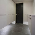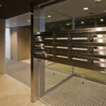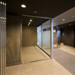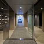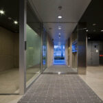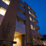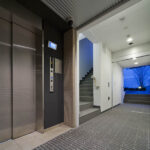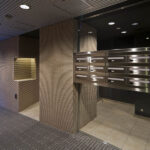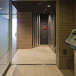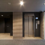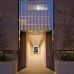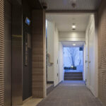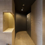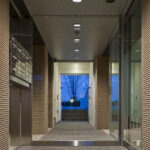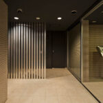 細割ボーダータイルと横ルーバーにより、建物のボリュームを抑え、圧迫感が少なくなるよう軽やかな表情を創出。